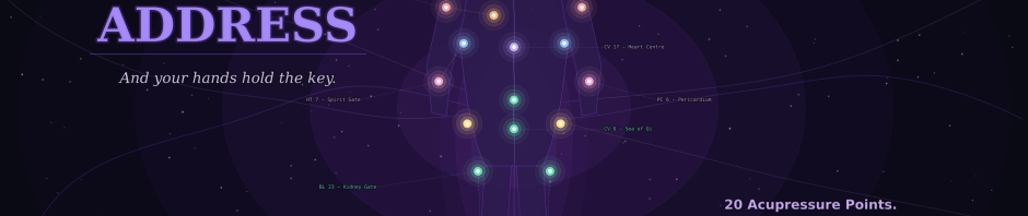 | Post 2 Daily Practice — Add These to Your Post 1 Foundation ① CV 17 — Chest centre (2 minutes, 4-7-8 breath throughout) ② KD 27 — Below collarbones (90 seconds each side, simultaneously) ③ LU 1 — Upper outer chest (90 seconds each side, gentle but sustained) ④ BL 23 — Lower back (2 minutes, tennis ball or partner press) ⑤ GV 4 — Ming Men / Gate of Life (90 seconds, warm palm pressure) ⑥ BL 15 — Mid-back heart point (90 seconds each side) ⑦ TW 15 — Shoulder summit (90 seconds each side, firm grip and release) ⑧ ST 36 — Below knee (2 minutes each leg, rebuilds depleted energy) Combined with the Post 1 sequence across morning and evening: a complete nervous system re-calibration. |