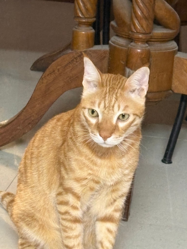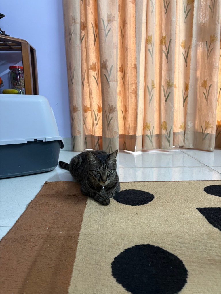 Kiwi, currently engaged in the very important business of napping on his purple blanket below, opened one amber eye sceptically. âLet me guess⌠youâve figured out how to open the treat cabinet?â đŞ