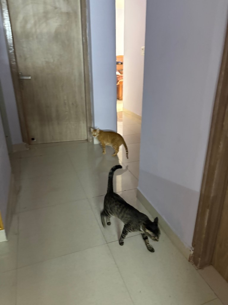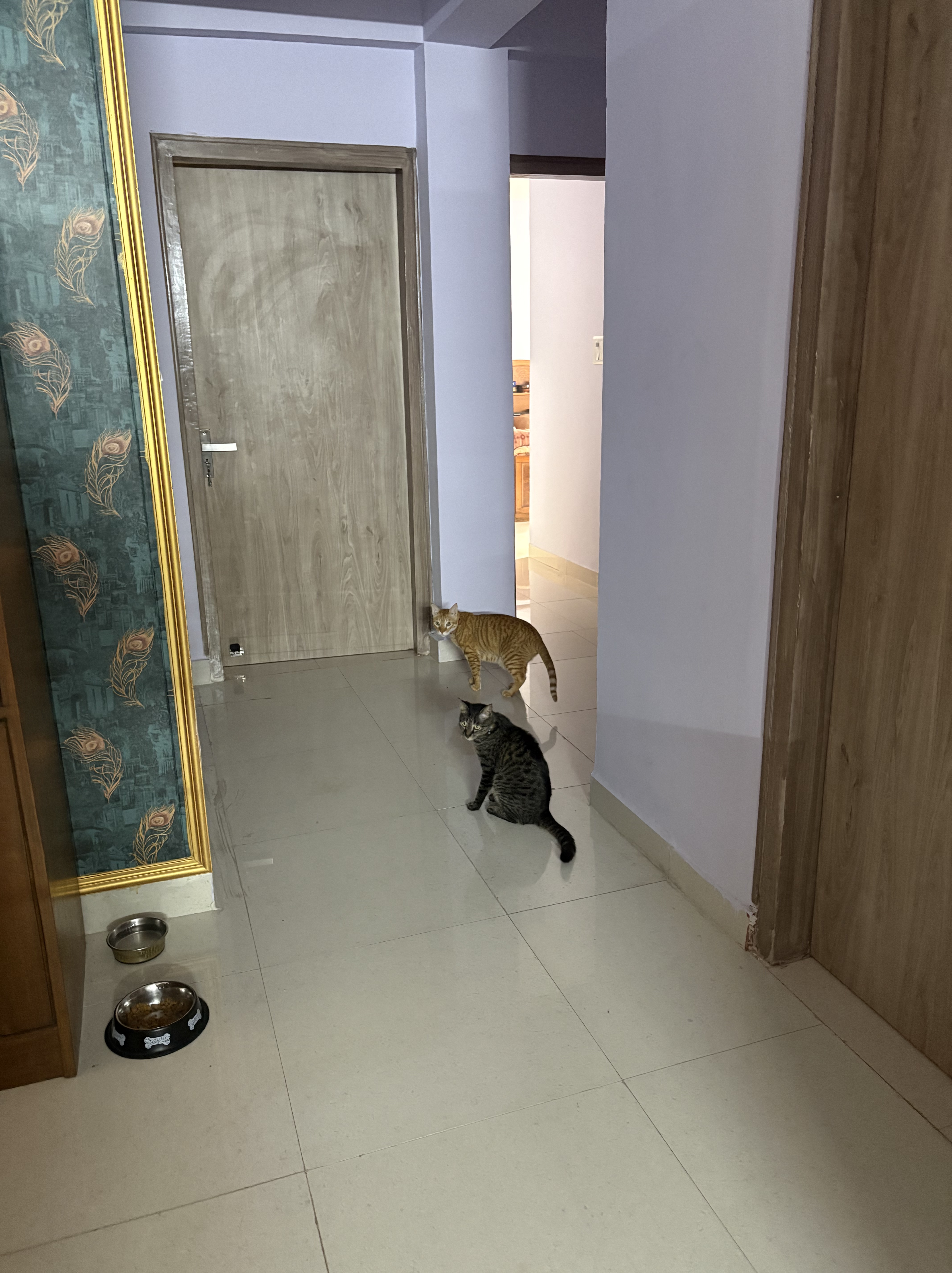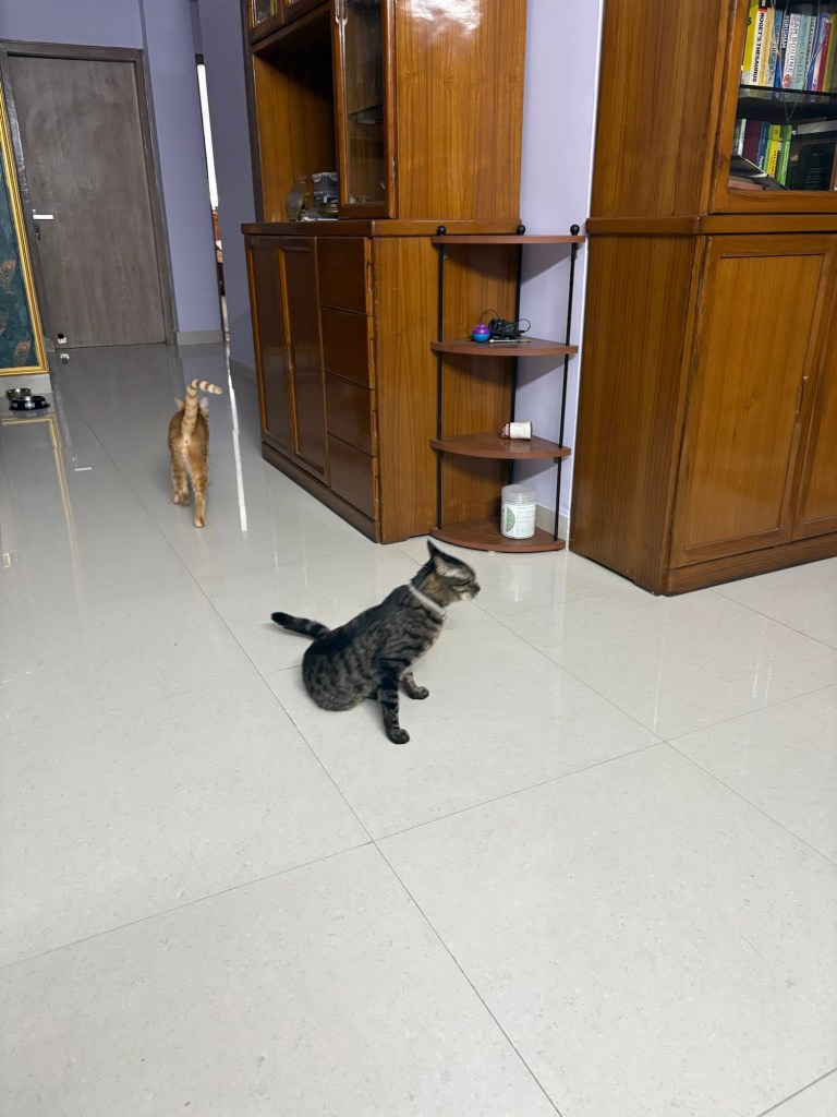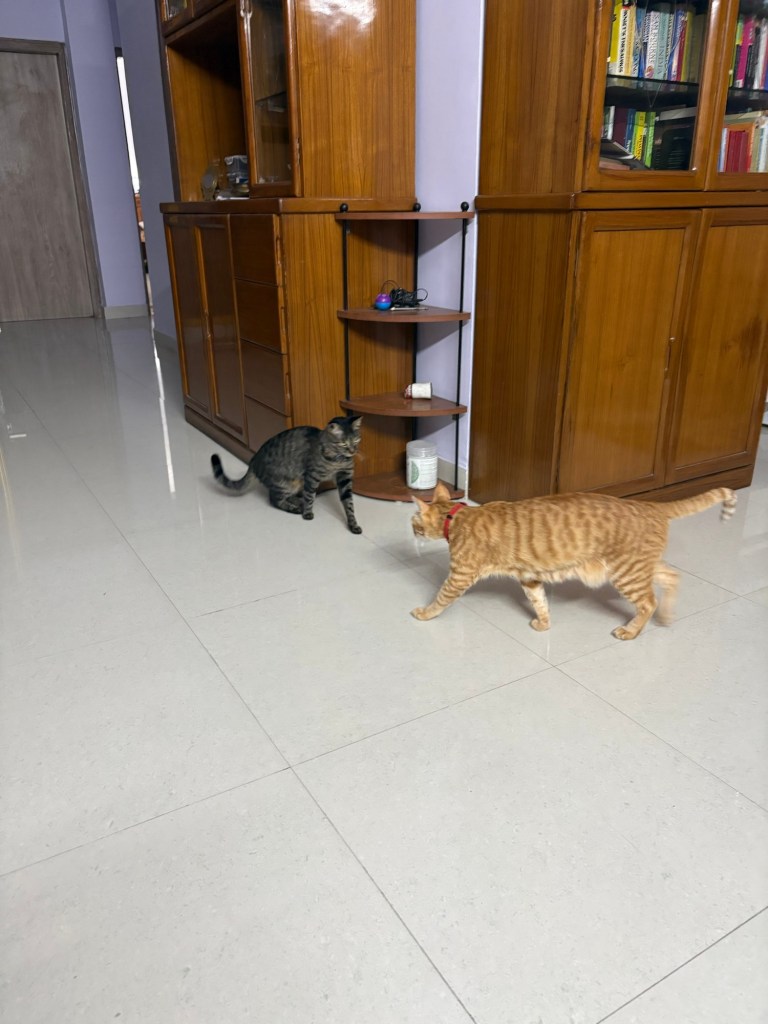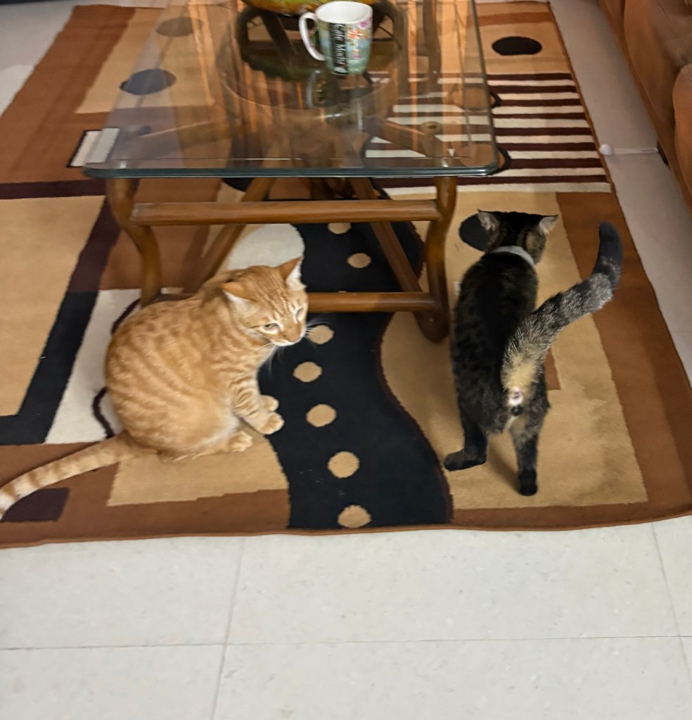 After their epic chase, both cats found themselves panting on the geometric rug, staring at each other across the vast expanse of⌠three feet. đ