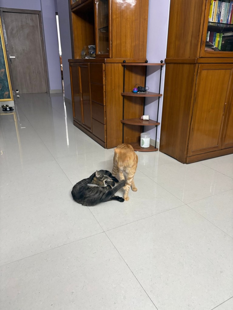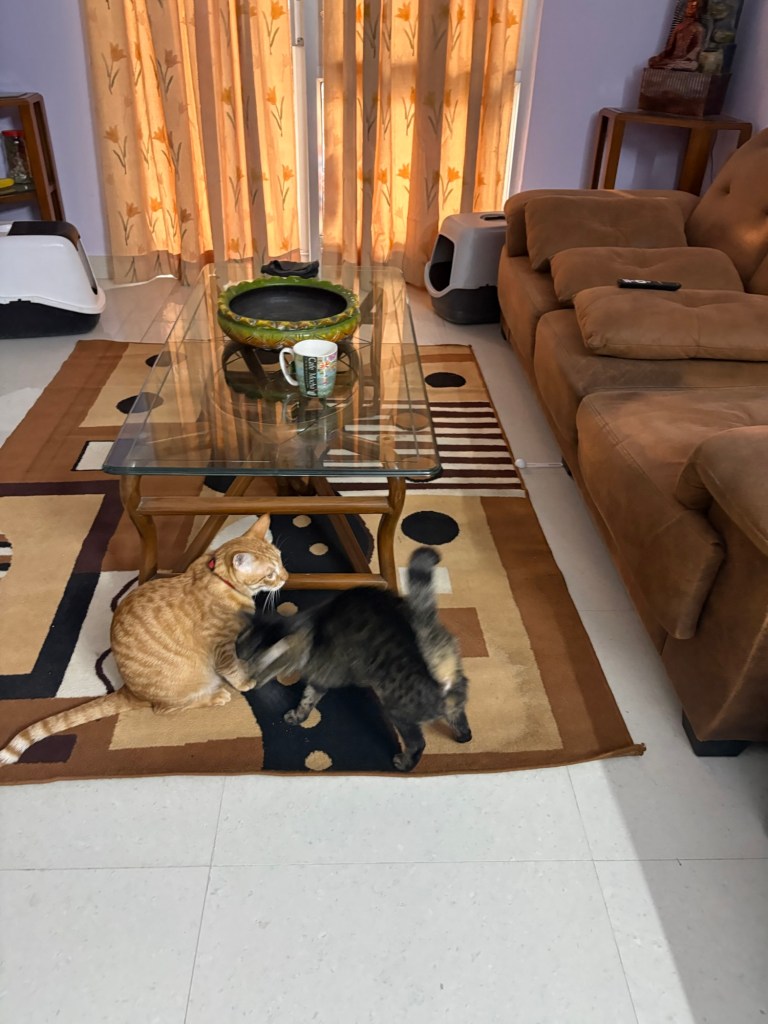 As the sun sets on another day in the household, Luna can be found conducting âimportant researchâ from her new favorite spot (the top of the bookshelf, because elevation equals authority, obviously), while Kiwi has mastered the art of the âstrategic blanket burrow.â đ
